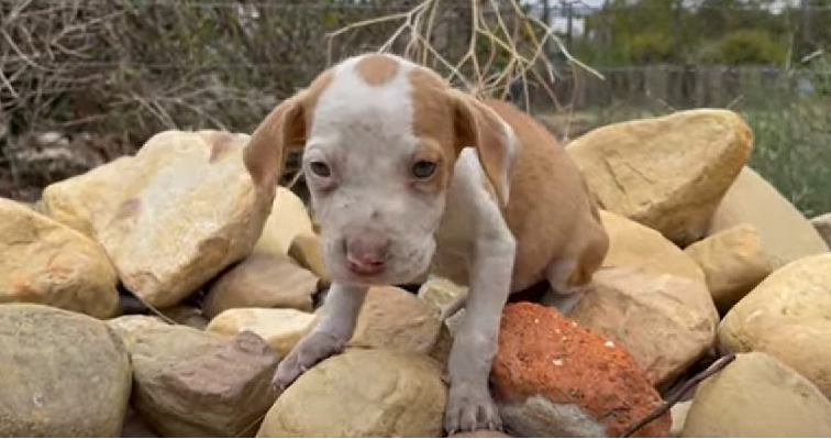 Recently, while conducting outreach, staff visited a home where a little dog in severe condition was present. Pumpkin, a sad pit bull puppy, was trembling and struggling to stand on some rocks.